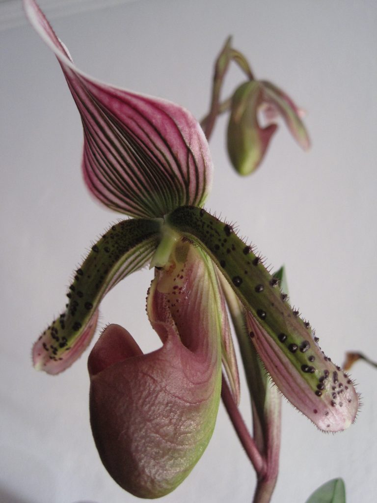 In jenem Jahr, von dem ich erzähle, öffnete ich das Wohnzimmerfenster und drapierte einen Lamettafaden auf dem Fensterbrett und mit einem sentimentalen Blick auf den hell erleuchteten Baum schloss ich die Tür, um im Kinderzimmer mit meiner Familie „aufs Christkind zu warten“. Wir lasen zusammen die Geschichte von Jesu Geburt, um den Kleinen den wahren Sinn von Weihnachten nahe zu bringen und mitten in die friedliche Stimmung brach sich ein Trotzanfall unserer Tochter die Bahn. Wir wissen nicht mehr, was ihren Zorn entfachte, nur noch, dass, da wir ja doch moderne Eltern waren, ein ziemlich anstrengendes und etwa zwei Stunden dauerndes Erziehungsgespräch erforderlich war, um den Weihnachtsabend zu retten. Als wir schließlich noch etwas verschnupft aber wieder versöhnt ins Wohnzimmer zur Bescherung schritten, mussten wir feststellen, dass meine wertvollste Orchidee, ein Frauenschuh, in der eisigen Zugluft des geöffneten Fensters erfroren war.